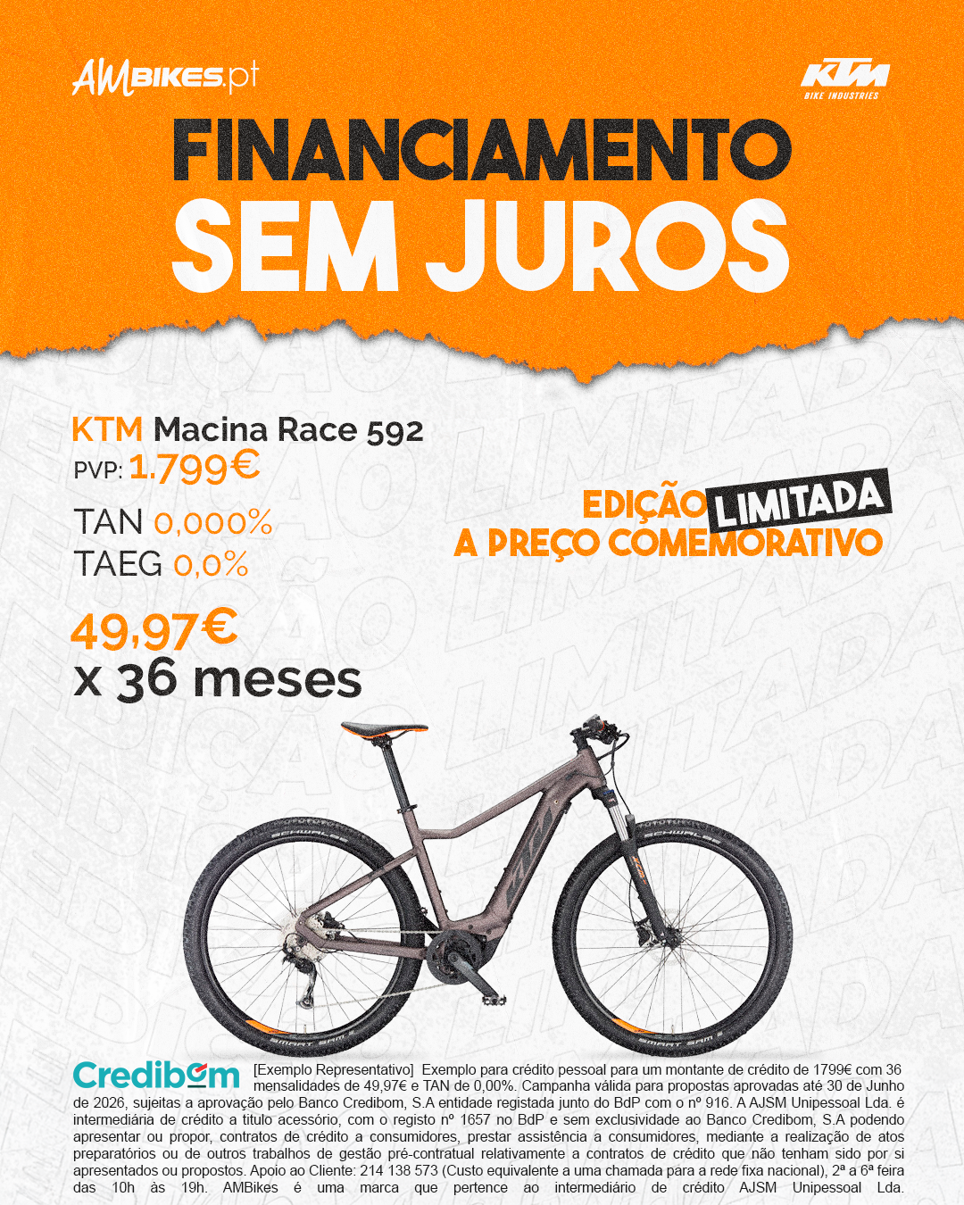 [Exemplo Representativo] Exemplo para crédito pessoal para um montante de crédito de 1799€ com 36 mensalidades de 49,97€ e TAN de 0,00%. Campanha válida para propostas aprovadas até 30 de Junho de 2026, sujeitas a aprovação pelo Banco Credibom, S.A entidade registada junto do BdP com o nº 916. A AJSM Unipessoal Lda. é intermediária de crédito a titulo acessório, com o registo nº 1657 no BdP e sem exclusividade ao Banco Credibom, S.A podendo apresentar ou propor, contratos de crédito a consumidores, prestar assistência a consumidores, mediante a realização de atos preparatórios ou de outros trabalhos de gestão pré-contratual relativamente a contratos de crédito que não tenham sido por si apresentados ou propostos. Apoio ao Cliente: 214 138 573 (Custo equivalente a uma chamada para a rede fixa nacional), 2ª a 6ª feira das 10h às 19h. AMBikes é uma marca que pertence ao intermediário de crédito AJSM Unipessoal Lda.