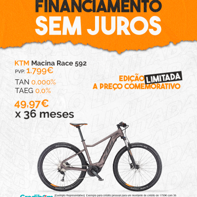 [Exemplo Representativo] Exemplo para crédito pessoal para um montante de crédito de 1799€ com 36 mensalidades de 49,97€ e TAN de 0,00%. Campanha válida para propostas aprovadas até 31 de março de 2026, sujeitas a aprovação pelo Banco Credibom, S.A entidade registada junto do BdP com o nº 916. A AJSM Unipessoal Lda. é intermediária de crédito a titulo acessório, com o registo nº 1657 no BdP e sem exclusividade ao Banco Credibom, S.A podendo apresentar ou propor, contratos de crédito a consumidores, prestar assistência a consumidores, mediante a realização de atos preparatórios ou de outros trabalhos de gestão pré-contratual relativamente a contratos de crédito que não tenham sido por si apresentados ou propostos. Apoio ao Cliente: 214 138 573 (Custo equivalente a uma chamada para a rede fixa nacional), 2ª a 6ª feira das 10h às 19h. AMBikes é uma marca que pertence ao intermediário de crédito AJSM Unipessoal Lda.
