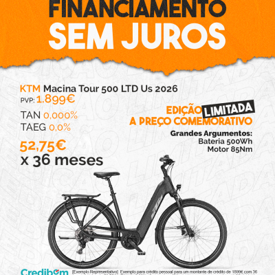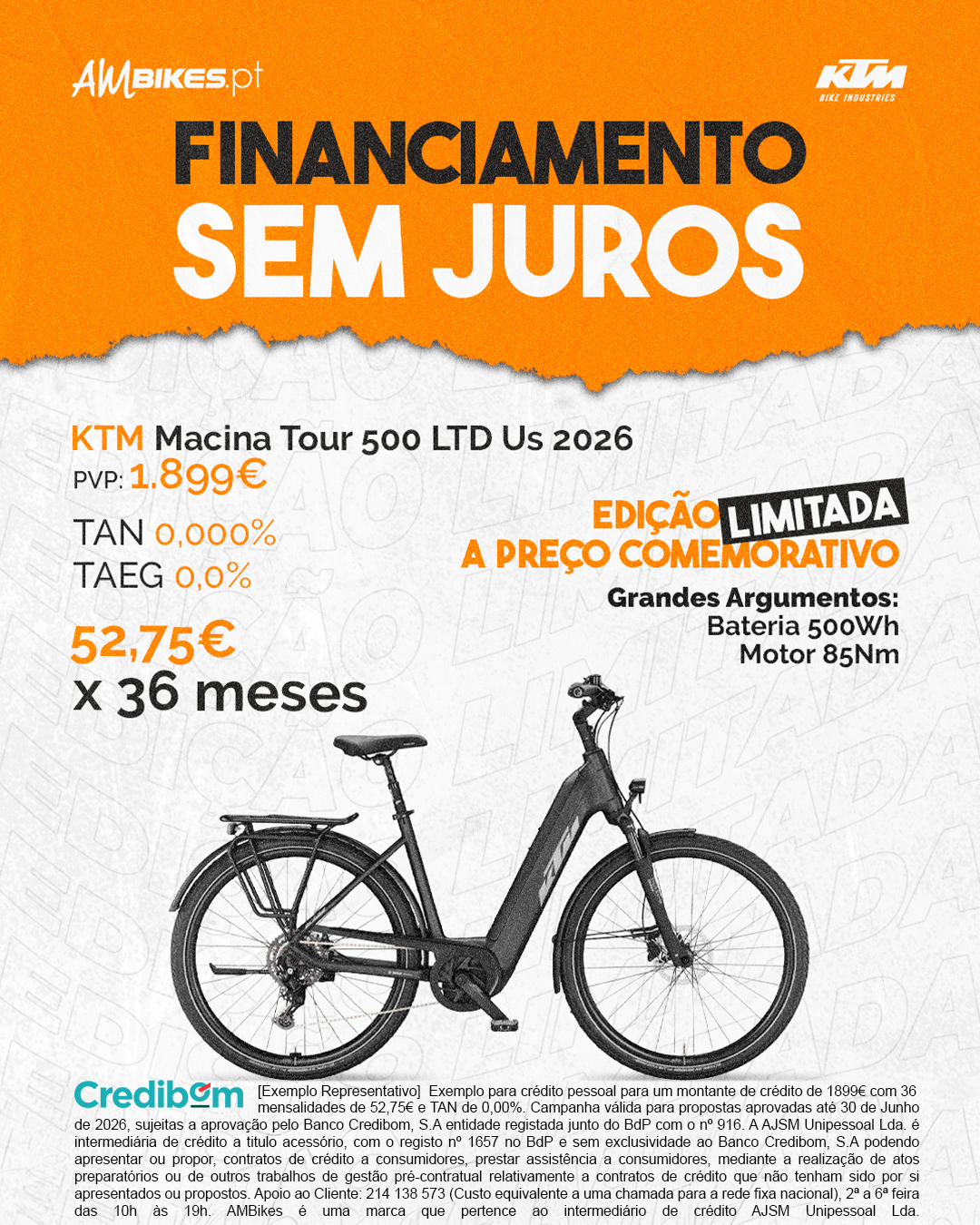 [Exemplo Representativo] Exemplo para crédito pessoal para um montante de crédito de 1.899€ com 36 mensalidades de 52,75€ e TAN de 0,00%. Campanha válida para propostas aprovadas até 30 de Junho de 2026, sujeitas a aprovação pelo Banco Credibom, S.A entidade registada junto do BdP com o nº 916. A AJSM Unipessoal Lda. é intermediária de crédito a titulo acessório, com o registo nº 1657 no BdP e sem exclusividade ao Banco Credibom, S.A podendo apresentar ou propor, contratos de crédito a consumidores, prestar assistência a consumidores, mediante a realização de atos preparatórios ou de outros trabalhos de gestão pré-contratual relativamente a contratos de crédito que não tenham sido por si apresentados ou propostos. Apoio ao Cliente: 214 138 573 (Custo equivalente a uma chamada para a rede fixa nacional), 2ª a 6ª feira das 10h às 19h. AMBikes é uma marca que pertence ao intermediário de crédito AJSM Unipessoal Lda.
