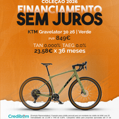[Exemplo Representativo] Exemplo para crédito pessoal para um montante de crédito de 849,00 € com 36 mensalidades de 23,58 € e TAN de 0,00%. Campanha válida para propostas aprovadas até 31 de Dezembro de 2025, sujeitas a aprovação pelo Banco Credibom, S.A., entidade registada junto do BdP com o n.º 916. A AJSM Unipessoal Lda. é intermediária de crédito a título acessório, com o registo n.º 1657 no BdP e sem exclusividade ao Banco Credibom, S.A., podendo apresentar ou propor contratos de crédito a consumidores, prestar assistência a consumidores mediante a realização de atos preparatórios ou outros trabalhos de gestão pré-contratual relativamente a contratos de crédito que não tenham sido por si apresentados ou propostos. Apoio ao Cliente: 214 138 573 (chamada para a rede fixa nacional), 2ª a 6ª feira das 10h às 19h. AMBikes é uma marca que pertence ao intermediário de crédito AJSM Unipessoal Lda.