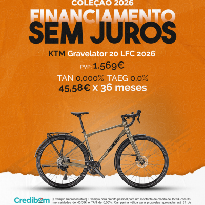 [Exemplo Representativo] Exemplo para crédito pessoal para um montante de crédito de 1.569,00 € com 36 mensalidades de 43,58 € e TAN de 0,00%. Campanha válida para propostas aprovadas até 31 de Dezembro de 2025, sujeitas a aprovação pelo Banco Credibom, S.A., entidade registada junto do BdP com o n.º 916. A AJSM Unipessoal Lda. é intermediária de crédito a título acessório, com o registo n.º 1657 no BdP e sem exclusividade ao Banco Credibom, S.A., podendo apresentar ou propor contratos de crédito a consumidores, prestar assistência a consumidores mediante a realização de atos preparatórios ou outros trabalhos de gestão pré-contratual relativamente a contratos de crédito que não tenham sido por si apresentados ou propostos. Apoio ao Cliente: 214 138 573 (chamada para a rede fixa nacional), 2ª a 6ª feira das 10h às 19h. AMBikes é uma marca que pertence ao intermediário de crédito AJSM Unipessoal Lda.