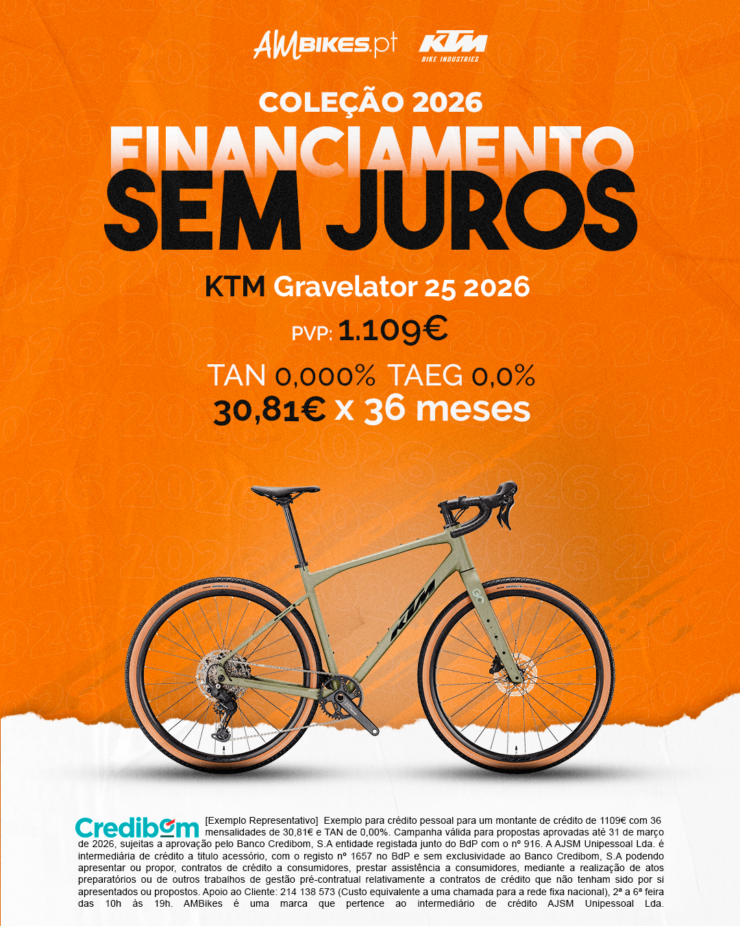 [Exemplo Representativo] Exemplo para crédito pessoal para um montante de crédito de 1.109,00 € com 36 mensalidades de 30,81 € e TAN de 0,00%. Campanha válida para propostas aprovadas até 31 de Março de 2026, sujeitas a aprovação pelo Banco Credibom, S.A., entidade registada junto do BdP com o n.º 916. A AJSM Unipessoal Lda. é intermediária de crédito a título acessório, com o registo n.º 1657 no BdP e sem exclusividade ao Banco Credibom, S.A., podendo apresentar ou propor contratos de crédito a consumidores, prestar assistência a consumidores mediante a realização de atos preparatórios ou outros trabalhos de gestão pré-contratual relativamente a contratos de crédito que não tenham sido por si apresentados ou propostos. Apoio ao Cliente: 214 138 573 (chamada para a rede fixa nacional), 2ª a 6ª feira das 10h às 19h. AMBikes é uma marca que pertence ao intermediário de crédito AJSM Unipessoal Lda.