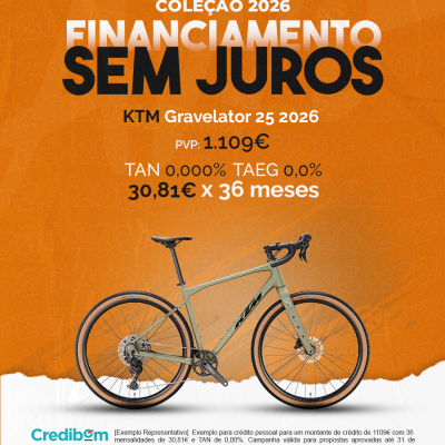 [Exemplo Representativo] Exemplo para crédito pessoal para um montante de crédito de 1.109,00 € com 36 mensalidades de 30,81 € e TAN de 0,00%. Campanha válida para propostas aprovadas até 31 de Dezembro de 2025, sujeitas a aprovação pelo Banco Credibom, S.A., entidade registada junto do BdP com o n.º 916. A AJSM Unipessoal Lda. é intermediária de crédito a título acessório, com o registo n.º 1657 no BdP e sem exclusividade ao Banco Credibom, S.A., podendo apresentar ou propor contratos de crédito a consumidores, prestar assistência a consumidores mediante a realização de atos preparatórios ou outros trabalhos de gestão pré-contratual relativamente a contratos de crédito que não tenham sido por si apresentados ou propostos. Apoio ao Cliente: 214 138 573 (chamada para a rede fixa nacional), 2ª a 6ª feira das 10h às 19h. AMBikes é uma marca que pertence ao intermediário de crédito AJSM Unipessoal Lda.