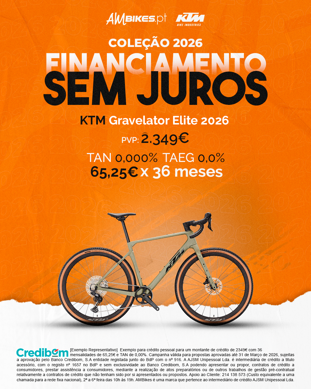 [Exemplo Representativo] Exemplo para crédito pessoal para um montante de crédito de 2.349,00 € com 36 mensalidades de 65,25 € e TAN de 0,00%. Campanha válida para propostas aprovadas até 31 de Dezembro de 2025, sujeitas a aprovação pelo Banco Credibom, S.A., entidade registada junto do BdP com o n.º 916. A AJSM Unipessoal Lda. é intermediária de crédito a título acessório, com o registo n.º 1657 no BdP e sem exclusividade ao Banco Credibom, S.A., podendo apresentar ou propor contratos de crédito a consumidores, prestar assistência a consumidores mediante a realização de atos preparatórios ou outros trabalhos de gestão pré-contratual relativamente a contratos de crédito que não tenham sido por si apresentados ou propostos. Apoio ao Cliente: 214 138 573 (chamada para a rede fixa nacional), 2ª a 6ª feira das 10h às 19h. AMBikes é uma marca que pertence ao intermediário de crédito AJSM Unipessoal Lda.