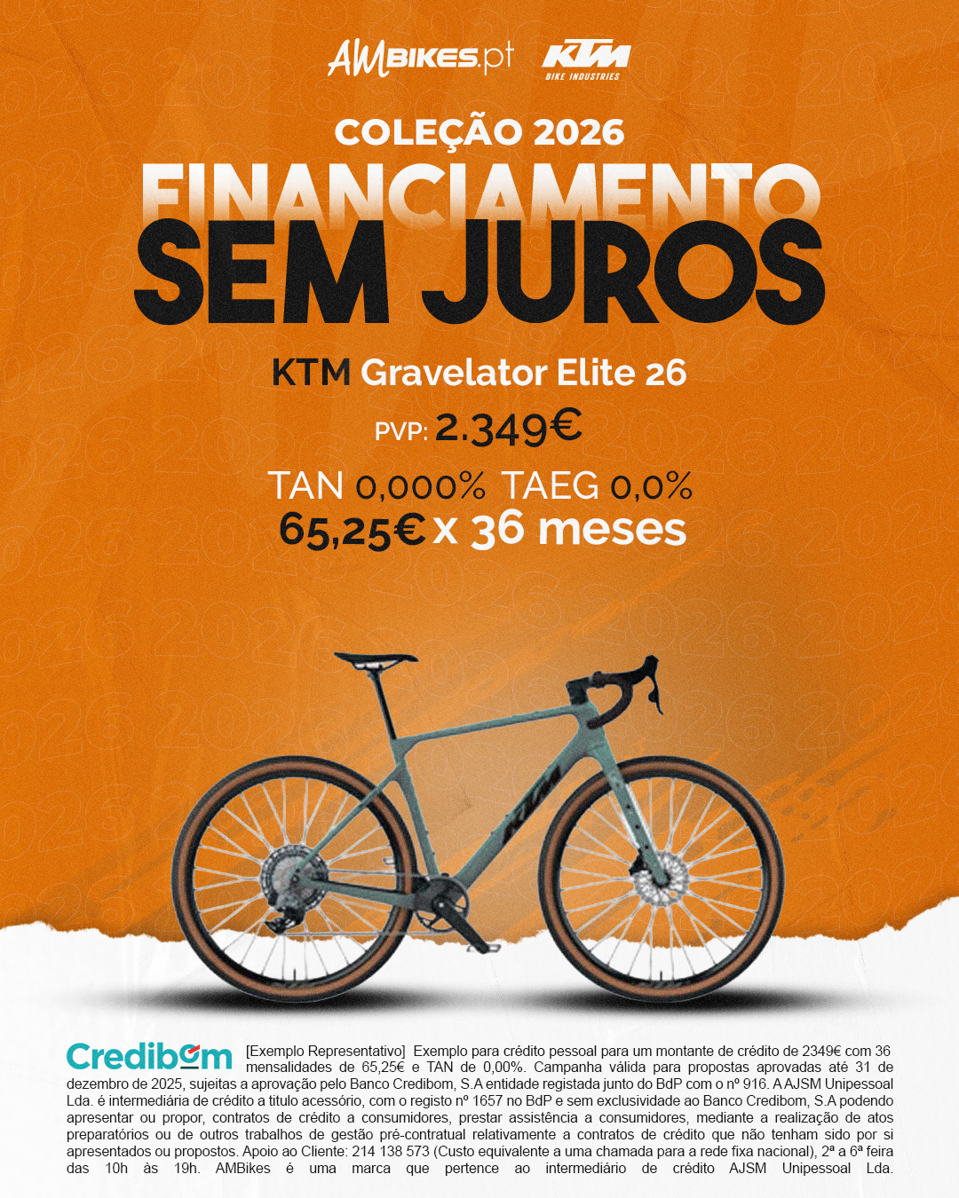 [Exemplo Representativo] Exemplo para crédito pessoal para um montante de crédito de 2349,00 € com 36 mensalidades de 65,25€ e TAN de 0,00%. Campanha válida para propostas aprovadas até 31 de Dezembro de 2025, sujeitas a aprovação pelo Banco Credibom, S.A., entidade registada junto do BdP com o n.º 916. A AJSM Unipessoal Lda. é intermediária de crédito a título acessório, com o registo n.º 1657 no BdP e sem exclusividade ao Banco Credibom, S.A., podendo apresentar ou propor contratos de crédito a consumidores, prestar assistência a consumidores mediante a realização de atos preparatórios ou outros trabalhos de gestão pré-contratual relativamente a contratos de crédito que não tenham sido por si apresentados ou propostos. Apoio ao Cliente: 214 138 573 (chamada para a rede fixa nacional), 2ª a 6ª feira das 10h às 19h. AMBikes é uma marca que pertence ao intermediário de crédito AJSM Unipessoal Lda.