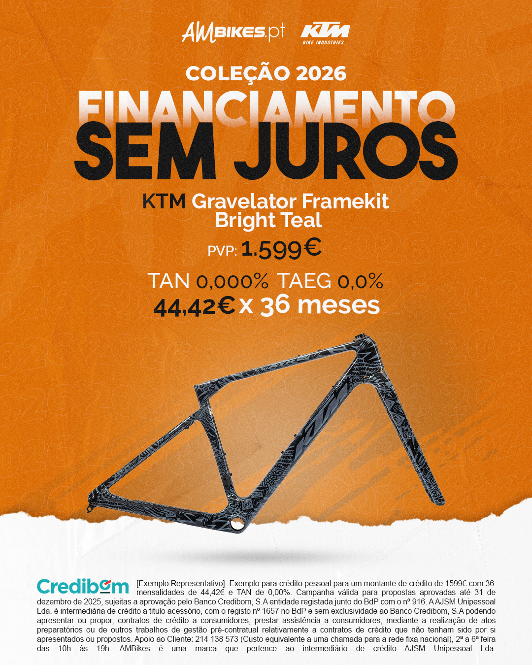 [Exemplo Representativo] Exemplo para crédito pessoal para um montante de crédito de 1.599,00 € com 36 mensalidades de 44,42€ e TAN de 0,00%. Campanha válida para propostas aprovadas até 31 de Dezembro de 2025, sujeitas a aprovação pelo Banco Credibom, S.A., entidade registada junto do BdP com o n.º 916. A AJSM Unipessoal Lda. é intermediária de crédito a título acessório, com o registo n.º 1657 no BdP e sem exclusividade ao Banco Credibom, S.A., podendo apresentar ou propor contratos de crédito a consumidores, prestar assistência a consumidores mediante a realização de atos preparatórios ou outros trabalhos de gestão pré-contratual relativamente a contratos de crédito que não tenham sido por si apresentados ou propostos. Apoio ao Cliente: 214 138 573 (chamada para a rede fixa nacional), 2ª a 6ª feira das 10h às 19h. AMBikes é uma marca que pertence ao intermediário de crédito AJSM Unipessoal Lda.