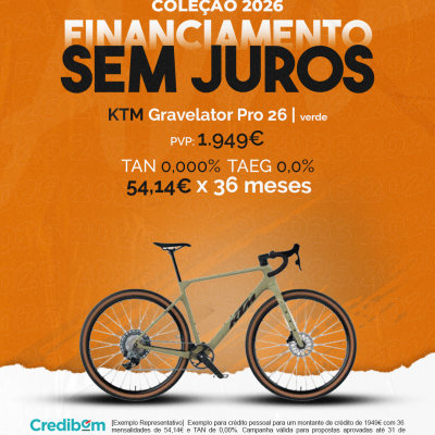 [Exemplo Representativo] Exemplo para crédito pessoal para um montante de crédito de 1.949,00 € com 36 mensalidades de 54,14€ e TAN de 0,00%. Campanha válida para propostas aprovadas até 31 de Dezembro de 2025, sujeitas a aprovação pelo Banco Credibom, S.A., entidade registada junto do BdP com o n.º 916. A AJSM Unipessoal Lda. é intermediária de crédito a título acessório, com o registo n.º 1657 no BdP e sem exclusividade ao Banco Credibom, S.A., podendo apresentar ou propor contratos de crédito a consumidores, prestar assistência a consumidores mediante a realização de atos preparatórios ou outros trabalhos de gestão pré-contratual relativamente a contratos de crédito que não tenham sido por si apresentados ou propostos. Apoio ao Cliente: 214 138 573 (chamada para a rede fixa nacional), 2ª a 6ª feira das 10h às 19h. AMBikes é uma marca que pertence ao intermediário de crédito AJSM Unipessoal Lda.