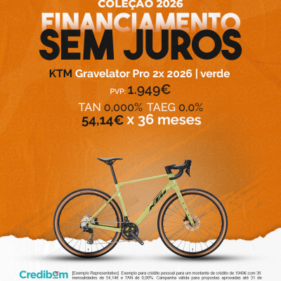 [Exemplo Representativo] Exemplo para crédito pessoal para um montante de crédito de 1.949,00 € com 36 mensalidades de 54,14 € e TAN de 0,00%. Campanha válida para propostas aprovadas até 31 de Dezembro de 2025, sujeitas a aprovação pelo Banco Credibom, S.A., entidade registada junto do BdP com o n.º 916. A AJSM Unipessoal Lda. é intermediária de crédito a título acessório, com o registo n.º 1657 no BdP e sem exclusividade ao Banco Credibom, S.A., podendo apresentar ou propor contratos de crédito a consumidores, prestar assistência a consumidores mediante a realização de atos preparatórios ou outros trabalhos de gestão pré-contratual relativamente a contratos de crédito que não tenham sido por si apresentados ou propostos. Apoio ao Cliente: 214 138 573 (chamada para a rede fixa nacional), 2ª a 6ª feira das 10h às 19h. AMBikes é uma marca que pertence ao intermediário de crédito AJSM Unipessoal Lda.