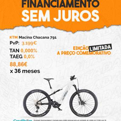 [Exemplo Representativo] Exemplo para crédito pessoal para um montante de crédito de 3199€ com 36 mensalidades de 88,86€ e TAN de 0,00%. Campanha válida para propostas aprovadas até 31 de dezembro de 2025, sujeitas a aprovação pelo Banco Credibom, S.A entidade registada junto do BdP com o nº 916. A AJSM Unipessoal Lda. é intermediária de crédito a titulo acessório, com o registo nº 1657 no BdP e sem exclusividade ao Banco Credibom, S.A podendo apresentar ou propor, contratos de crédito a consumidores, prestar assistência a consumidores, mediante a realização de atos preparatórios ou de outros trabalhos de gestão pré-contratual relativamente a contratos de crédito que não tenham sido por si apresentados ou propostos. Apoio ao Cliente: 214 138 573 (Custo equivalente a uma chamada para a rede fixa nacional), 2ª a 6ª feira das 10h às 19h. AMBikes é uma marca que pertence ao intermediário de crédito AJSM Unipessoal Lda.