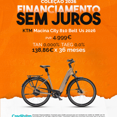 [Exemplo Representativo] Exemplo para crédito pessoal para um montante de crédito de 4.999,00 € com 36 mensalidades de 138,86 € e TAN de 0,00%. Campanha válida para propostas aprovadas até 31 de Março de 2026, sujeitas a aprovação pelo Banco Credibom, S.A., entidade registada junto do BdP com o n.º 916. A AJSM Unipessoal Lda. é intermediária de crédito a título acessório, com o registo n.º 1657 no BdP e sem exclusividade ao Banco Credibom, S.A., podendo apresentar ou propor contratos de crédito a consumidores, prestar assistência a consumidores mediante a realização de atos preparatórios ou outros trabalhos de gestão pré-contratual relativamente a contratos de crédito que não tenham sido por si apresentados ou propostos. Apoio ao Cliente: 214 138 573 (chamada para a rede fixa nacional), 2ª a 6ª feira das 10h às 19h. AMBikes é uma marca que pertence ao intermediário de crédito AJSM Unipessoal Lda.