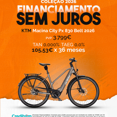 [Exemplo Representativo] Exemplo para crédito pessoal para um montante de crédito de 3.799,00 € com 36 mensalidades de 105,53 € e TAN de 0,00%. Campanha válida para propostas aprovadas até 31 de Março de 2026, sujeitas a aprovação pelo Banco Credibom, S.A., entidade registada junto do BdP com o n.º 916. A AJSM Unipessoal Lda. é intermediária de crédito a título acessório, com o registo n.º 1657 no BdP e sem exclusividade ao Banco Credibom, S.A., podendo apresentar ou propor contratos de crédito a consumidores, prestar assistência a consumidores mediante a realização de atos preparatórios ou outros trabalhos de gestão pré-contratual relativamente a contratos de crédito que não tenham sido por si apresentados ou propostos. Apoio ao Cliente: 214 138 573 (chamada para a rede fixa nacional), 2ª a 6ª feira das 10h às 19h. AMBikes é uma marca que pertence ao intermediário de crédito AJSM Unipessoal Lda.
