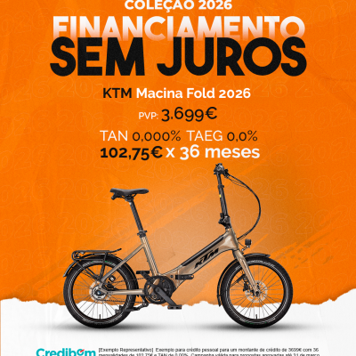 [Exemplo Representativo] Exemplo para crédito pessoal para um montante de crédito de 3.699,00 € com 36 mensalidades de 102,75 € e TAN de 0,00%. Campanha válida para propostas aprovadas até 31 de Março de 2026, sujeitas a aprovação pelo Banco Credibom, S.A., entidade registada junto do BdP com o n.º 916. A AJSM Unipessoal Lda. é intermediária de crédito a título acessório, com o registo n.º 1657 no BdP e sem exclusividade ao Banco Credibom, S.A., podendo apresentar ou propor contratos de crédito a consumidores, prestar assistência a consumidores mediante a realização de atos preparatórios ou outros trabalhos de gestão pré-contratual relativamente a contratos de crédito que não tenham sido por si apresentados ou propostos. Apoio ao Cliente: 214 138 573 (chamada para a rede fixa nacional), 2ª a 6ª feira das 10h às 19h. AMBikes é uma marca que pertence ao intermediário de crédito AJSM Unipessoal Lda.
