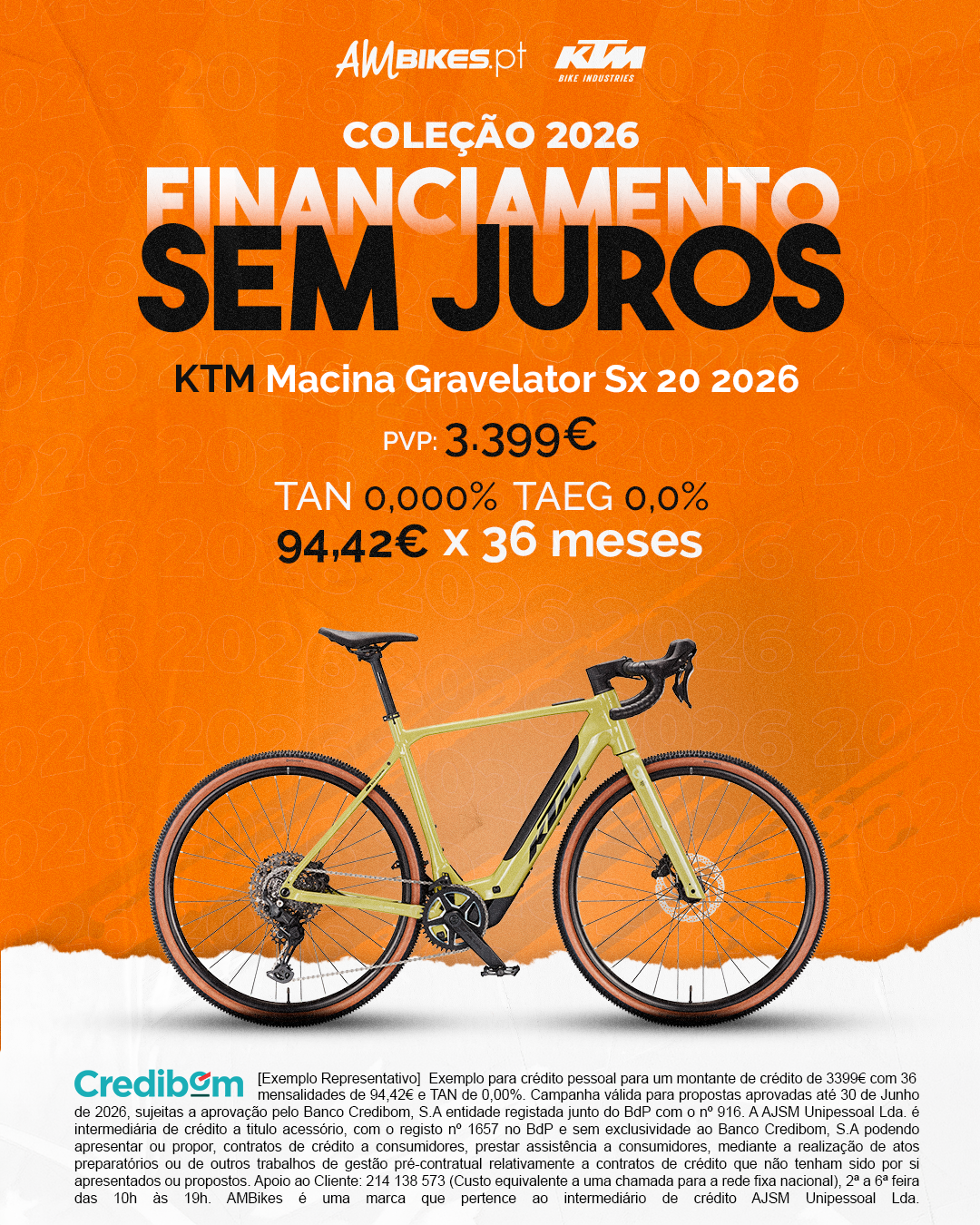 [Exemplo Representativo] Exemplo para crédito pessoal para um montante de crédito de 3.399,00 € com 36 mensalidades de 94,42 € e TAN de 0,00%. Campanha válida para propostas aprovadas até 30 de junho de 2026, sujeitas a aprovação pelo Banco Credibom, S.A., entidade registada junto do BdP com o n.º 916. A AJSM Unipessoal Lda. é intermediária de crédito a título acessório, com o registo n.º 1657 no BdP e sem exclusividade ao Banco Credibom, S.A., podendo apresentar ou propor contratos de crédito a consumidores, prestar assistência a consumidores mediante a realização de atos preparatórios ou outros trabalhos de gestão pré-contratual relativamente a contratos de crédito que não tenham sido por si apresentados ou propostos. Apoio ao Cliente: 214 138 573 (chamada para a rede fixa nacional), 2ª a 6ª feira das 10h às 19h. AMBikes é uma marca que pertence ao intermediário de crédito AJSM Unipessoal Lda.