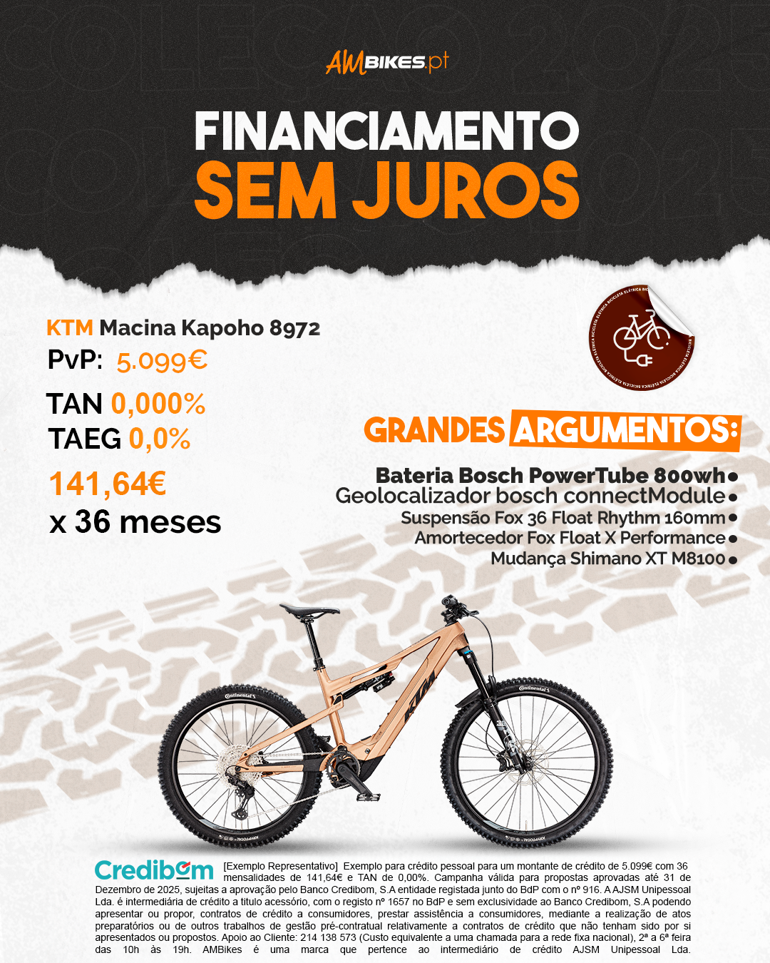 [Exemplo Representativo] Exemplo para crédito pessoal para um montante de crédito de 5099€ com 36 mensalidades de 141,64€ e TAN de 0,00%. Campanha válida para propostas aprovadas até 31 de Dezembro de 2025, sujeitas a aprovação pelo Banco Credibom, S.A entidade registada junto do BdP com o nº 916. A AJSM Unipessoal Lda. é intermediária de crédito a titulo acessório, com o registo nº 1657 no BdP e sem exclusividade ao Banco Credibom, S.A podendo apresentar ou propor, contratos de crédito a consumidores, prestar assistência a consumidores, mediante a realização de atos preparatórios ou de outros trabalhos de gestão pré-contratual relativamente a contratos de crédito que não tenham sido por si apresentados ou propostos. Apoio ao Cliente: 214 138 573 (Custo equivalente a uma chamada para a rede fixa nacional), 2ª a 6ª feira das 10h às 19h. AMBikes é uma marca que pertence ao intermediário de crédito AJSM Unipessoal Lda.