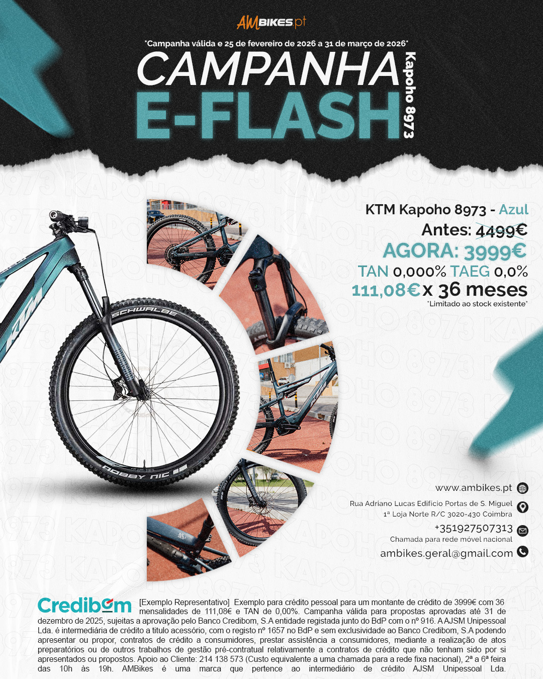 [Exemplo Representativo] Exemplo para crédito pessoal para um montante de crédito de 3.999,00 € com 36 mensalidades de 111,08 € e TAN de 0,00%. Campanha válida para propostas aprovadas até 31 de março de 2026, sujeitas a aprovação pelo Banco Credibom, S.A., entidade registada junto do BdP com o n.º 916. A AJSM Unipessoal Lda. é intermediária de crédito a título acessório, com o registo n.º 1657 no BdP e sem exclusividade ao Banco Credibom, S.A., podendo apresentar ou propor contratos de crédito a consumidores, prestar assistência a consumidores mediante a realização de atos preparatórios ou outros trabalhos de gestão pré-contratual relativamente a contratos de crédito que não tenham sido por si apresentados ou propostos. Apoio ao Cliente: 214 138 573 (chamada para a rede fixa nacional), 2ª a 6ª feira das 10h às 19h. AMBikes é uma marca que pertence ao intermediário de crédito AJSM Unipessoal Lda.