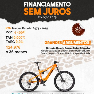[Exemplo Representativo] Exemplo para crédito pessoal para um montante de crédito de 4499€ com 36 mensalidades de 124,97€ e TAN de 0,00%. Campanha válida para propostas aprovadas até 31 de Dezembro de 2025, sujeitas a aprovação pelo Banco Credibom, S.A entidade registada junto do BdP com o nº 916. A AJSM Unipessoal Lda. é intermediária de crédito a titulo acessório, com o registo nº 1657 no BdP e sem exclusividade ao Banco Credibom, S.A podendo apresentar ou propor, contratos de crédito a consumidores, prestar assistência a consumidores, mediante a realização de atos preparatórios ou de outros trabalhos de gestão pré-contratual relativamente a contratos de crédito que não tenham sido por si apresentados ou propostos. Apoio ao Cliente: 214 138 573 (Custo equivalente a uma chamada para a rede fixa nacional), 2ª a 6ª feira das 10h às 19h. AMBikes é uma marca que pertence ao intermediário de crédito AJSM Unipessoal Lda.