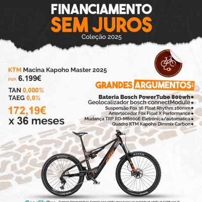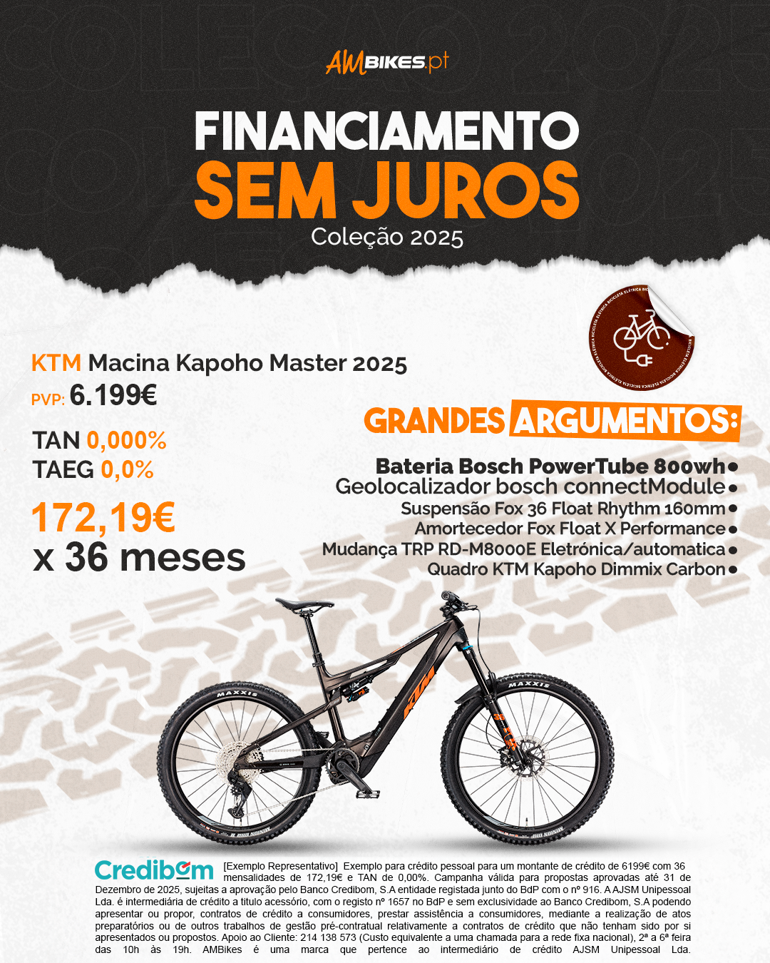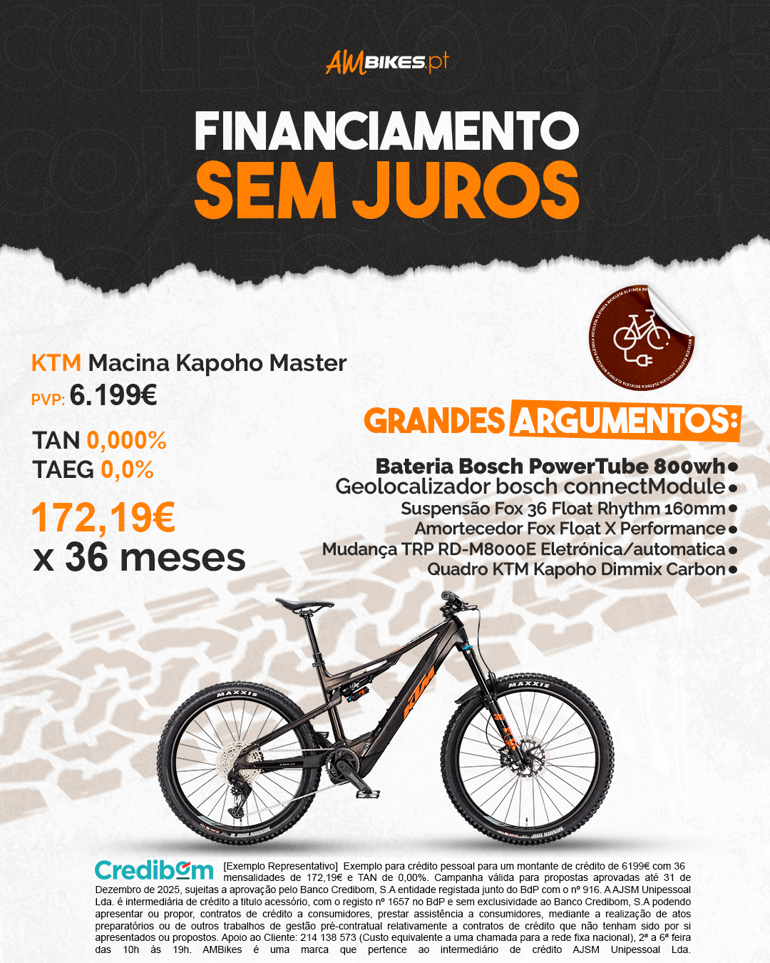 [Exemplo Representativo] Exemplo para crédito pessoal para um montante de crédito de 6199€ com 36 mensalidades de 172,19€ e TAN de 0,00%. Campanha válida para propostas aprovadas até 30 de setembro de 2025, sujeitas a aprovação pelo Banco Credibom, S.A entidade registada junto do BdP com o nº 916. A AJSM Unipessoal Lda. é intermediária de crédito a titulo acessório, com o registo nº 1657 no BdP e sem exclusividade ao Banco Credibom, S.A podendo apresentar ou propor, contratos de crédito a consumidores, prestar assistência a consumidores, mediante a realização de atos preparatórios ou de outros trabalhos de gestão pré-contratual relativamente a contratos de crédito que não tenham sido por si apresentados ou propostos. Apoio ao Cliente: 214 138 573 (Custo equivalente a uma chamada para a rede fixa nacional), 2ª a 6ª feira das 10h às 19h. AMBikes é uma marca que pertence ao intermediário de crédito AJSM Unipessoal Lda.