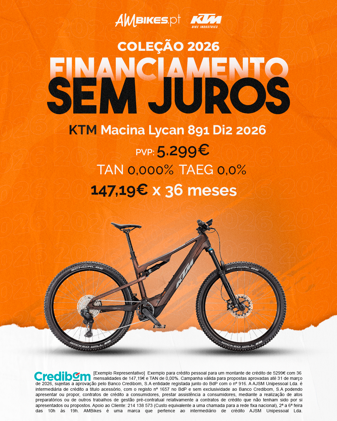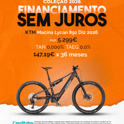 [Exemplo Representativo] Exemplo para crédito pessoal para um montante de crédito de 5.299,00 € com 36 mensalidades de 147,19 € e TAN de 0,00%. Campanha válida para propostas aprovadas até31 de março de 2026, sujeitas a aprovação pelo Banco Credibom, S.A., entidade registada junto do BdP com o n.º 916. A AJSM Unipessoal Lda. é intermediária de crédito a título acessório, com o registo n.º 1657 no BdP e sem exclusividade ao Banco Credibom, S.A., podendo apresentar ou propor contratos de crédito a consumidores, prestar assistência a consumidores mediante a realização de atos preparatórios ou outros trabalhos de gestão pré-contratual relativamente a contratos de crédito que não tenham sido por si apresentados ou propostos. Apoio ao Cliente: 214 138 573 (chamada para a rede fixa nacional), 2ª a 6ª feira das 10h às 19h. AMBikes é uma marca que pertence ao intermediário de crédito AJSM Unipessoal Lda.
