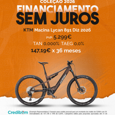 [Exemplo Representativo] Exemplo para crédito pessoal para um montante de crédito de 5.299,00 € com 36 mensalidades de 147,19 € e TAN de 0,00%. Campanha válida para propostas aprovadas até 31 de Dezembro de 2025, sujeitas a aprovação pelo Banco Credibom, S.A., entidade registada junto do BdP com o n.º 916. A AJSM Unipessoal Lda. é intermediária de crédito a título acessório, com o registo n.º 1657 no BdP e sem exclusividade ao Banco Credibom, S.A., podendo apresentar ou propor contratos de crédito a consumidores, prestar assistência a consumidores mediante a realização de atos preparatórios ou outros trabalhos de gestão pré-contratual relativamente a contratos de crédito que não tenham sido por si apresentados ou propostos. Apoio ao Cliente: 214 138 573 (chamada para a rede fixa nacional), 2ª a 6ª feira das 10h às 19h. AMBikes é uma marca que pertence ao intermediário de crédito AJSM Unipessoal Lda.