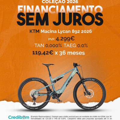 [Exemplo Representativo] Exemplo para crédito pessoal para um montante de crédito de 4.299,00 € com 36 mensalidades de 119,42 € e TAN de 0,00%. Campanha válida para propostas aprovadas até 31 de Dezembro de 2025, sujeitas a aprovação pelo Banco Credibom, S.A., entidade registada junto do BdP com o n.º 916. A AJSM Unipessoal Lda. é intermediária de crédito a título acessório, com o registo n.º 1657 no BdP e sem exclusividade ao Banco Credibom, S.A., podendo apresentar ou propor contratos de crédito a consumidores, prestar assistência a consumidores mediante a realização de atos preparatórios ou outros trabalhos de gestão pré-contratual relativamente a contratos de crédito que não tenham sido por si apresentados ou propostos. Apoio ao Cliente: 214 138 573 (chamada para a rede fixa nacional), 2ª a 6ª feira das 10h às 19h. AMBikes é uma marca que pertence ao intermediário de crédito AJSM Unipessoal Lda.