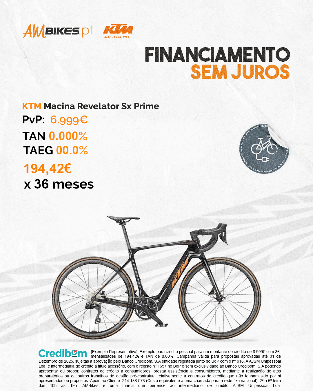 [Exemplo Representativo] Exemplo para crédito pessoal para um montante de crédito de 6999€ com 36 mensalidades de 194,42€ e TAN de 0,00%. Campanha válida para propostas aprovadas até 31 de Dezembro de 2025, sujeitas a aprovação pelo Banco Credibom, S.A entidade registada junto do BdP com o nº 916. A AJSM Unipessoal Lda. é intermediária de crédito a titulo acessório, com o registo nº 1657 no BdP e sem exclusividade ao Banco Credibom, S.A podendo apresentar ou propor, contratos de crédito a consumidores, prestar assistência a consumidores, mediante a realização de atos preparatórios ou de outros trabalhos de gestão pré-contratual relativamente a contratos de crédito que não tenham sido por si apresentados ou propostos. Apoio ao Cliente: 214 138 573 (Custo equivalente a uma chamada para a rede fixa nacional), 2ª a 6ª feira das 10h às 19h. AMBikes é uma marca que pertence ao intermediário de crédito AJSM Unipessoal Lda.
