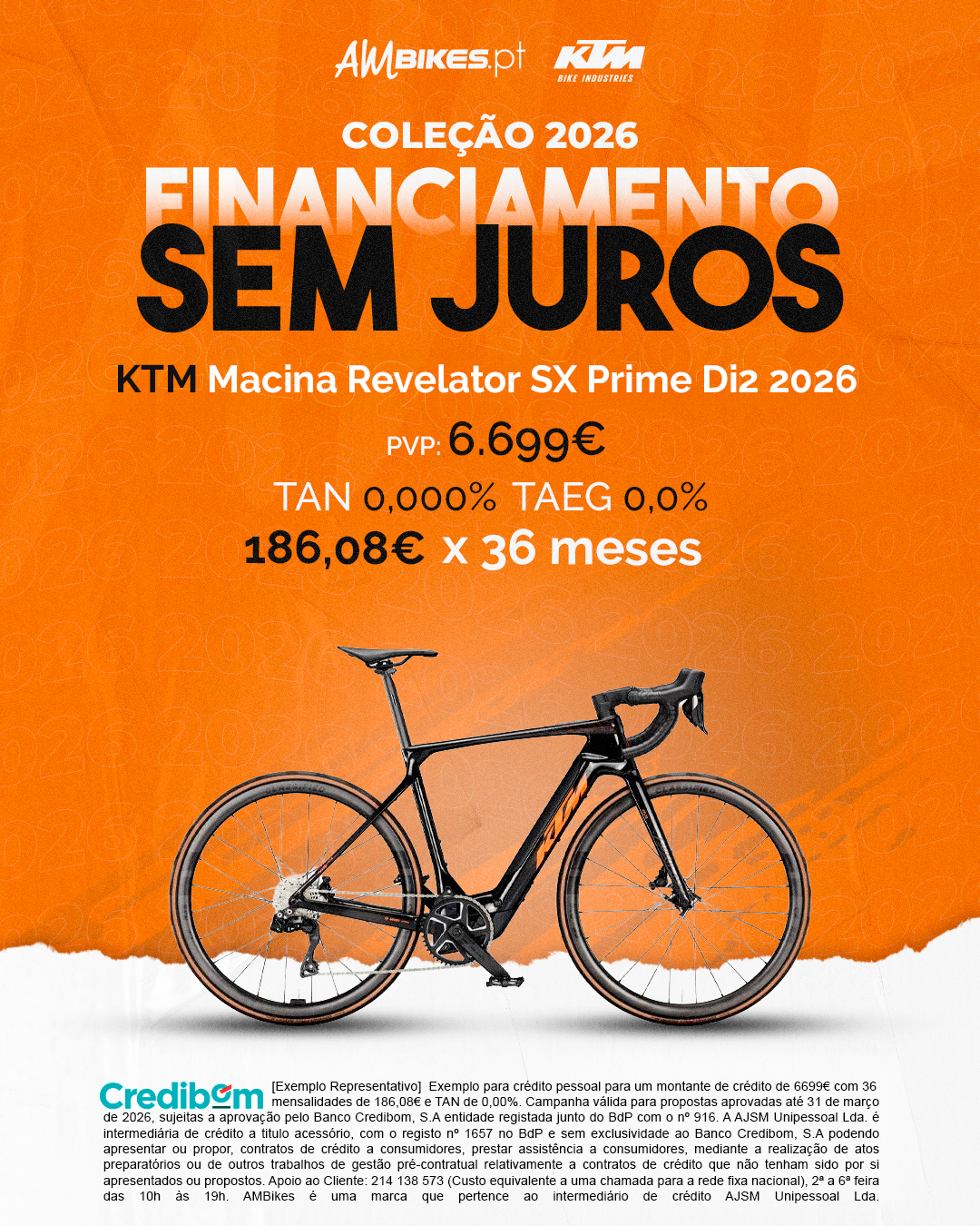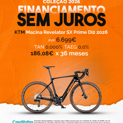 [Exemplo Representativo] Exemplo para crédito pessoal para um montante de crédito de 6.699,00 € com 36 mensalidades de 186,08€ e TAN de 0,00%. Campanha válida para propostas aprovadas até 31 de março de 2026, sujeitas a aprovação pelo Banco Credibom, S.A., entidade registada junto do BdP com o n.º 916. A AJSM Unipessoal Lda. é intermediária de crédito a título acessório, com o registo n.º 1657 no BdP e sem exclusividade ao Banco Credibom, S.A., podendo apresentar ou propor contratos de crédito a consumidores, prestar assistência a consumidores mediante a realização de atos preparatórios ou outros trabalhos de gestão pré-contratual relativamente a contratos de crédito que não tenham sido por si apresentados ou propostos. Apoio ao Cliente: 214 138 573 (chamada para a rede fixa nacional), 2ª a 6ª feira das 10h às 19h. AMBikes é uma marca que pertence ao intermediário de crédito AJSM Unipessoal Lda.