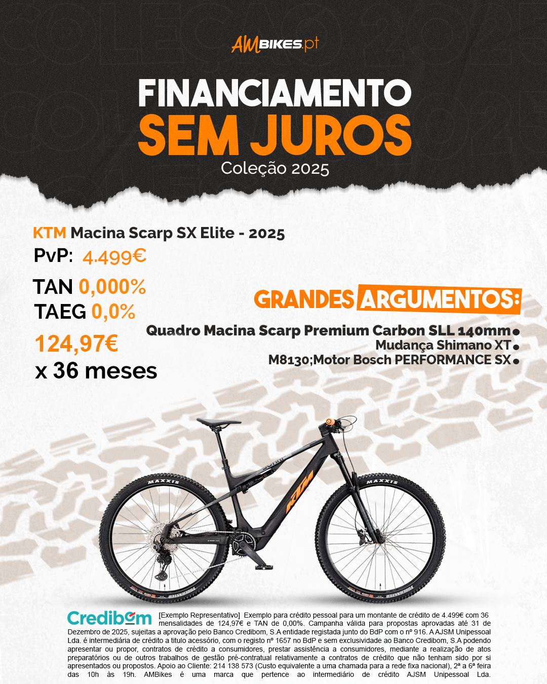 [Exemplo Representativo] Exemplo para crédito pessoal para um montante de crédito de 4499€ com 36 mensalidades de 124,97€ e TAN de 0,00%. Campanha válida para propostas aprovadas até 31 de Dezembro de 2025, sujeitas a aprovação pelo Banco Credibom, S.A entidade registada junto do BdP com o nº 916. A AJSM Unipessoal Lda. é intermediária de crédito a titulo acessório, com o registo nº 1657 no BdP e sem exclusividade ao Banco Credibom, S.A podendo apresentar ou propor, contratos de crédito a consumidores, prestar assistência a consumidores, mediante a realização de atos preparatórios ou de outros trabalhos de gestão pré-contratual relativamente a contratos de crédito que não tenham sido por si apresentados ou propostos. Apoio ao Cliente: 214 138 573 (Custo equivalente a uma chamada para a rede fixa nacional), 2ª a 6ª feira das 10h às 19h. AMBikes é uma marca que pertence ao intermediário de crédito AJSM Unipessoal Lda.