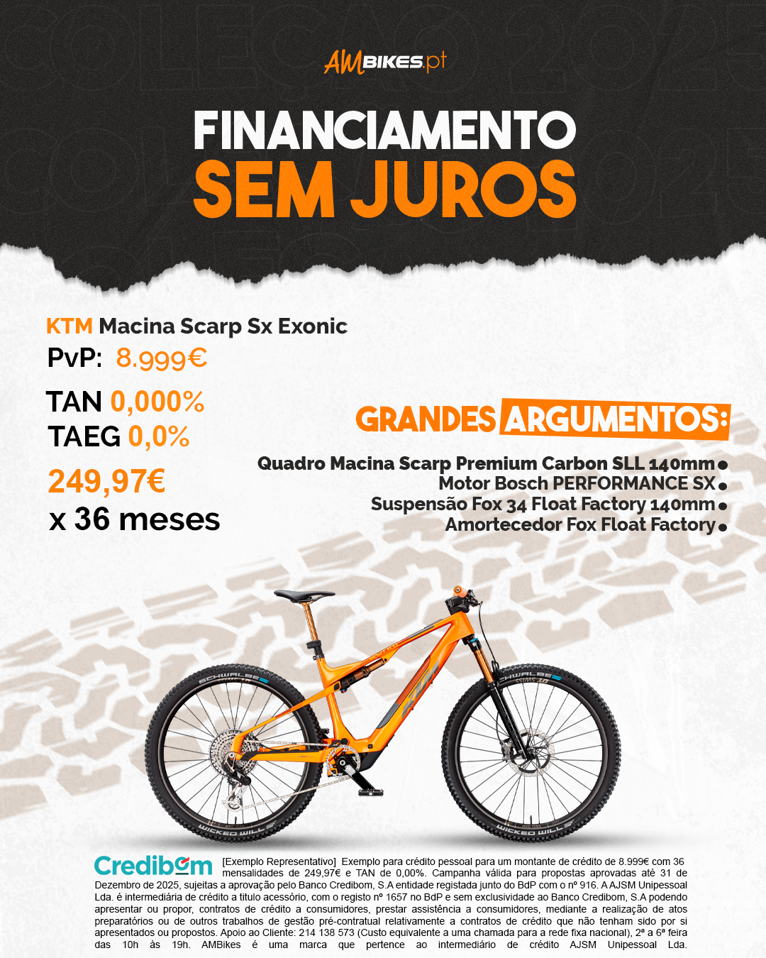[Exemplo Representativo] Exemplo para crédito pessoal para um montante de crédito de 8999€ com 36 mensalidades de 249,97€ e TAN de 0,00%. Campanha válida para propostas aprovadas até 31 de Dezembro de 2025, sujeitas a aprovação pelo Banco Credibom, S.A entidade registada junto do BdP com o nº 916. A AJSM Unipessoal Lda. é intermediária de crédito a titulo acessório, com o registo nº 1657 no BdP e sem exclusividade ao Banco Credibom, S.A podendo apresentar ou propor, contratos de crédito a consumidores, prestar assistência a consumidores, mediante a realização de atos preparatórios ou de outros trabalhos de gestão pré-contratual relativamente a contratos de crédito que não tenham sido por si apresentados ou propostos. Apoio ao Cliente: 214 138 573 (Custo equivalente a uma chamada para a rede fixa nacional), 2ª a 6ª feira das 10h às 19h. AMBikes é uma marca que pertence ao intermediário de crédito AJSM Unipessoal Lda.