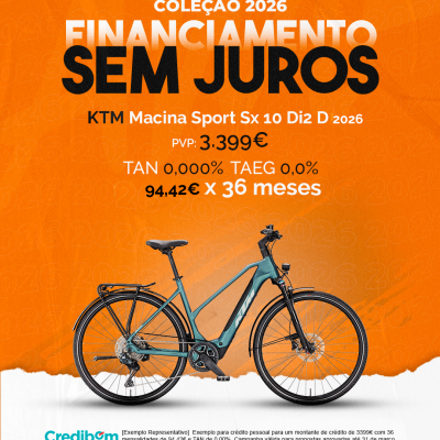 [Exemplo Representativo] Exemplo para crédito pessoal para um montante de crédito de 3.399€ com 36 mensalidades de 94,42€ e TAN de 0,00%. Campanha válida para propostas aprovadas até 31 de março de 2026, sujeitas a aprovação pelo Banco Credibom, S.A., entidade registada junto do BdP com o n.º 916. A AJSM Unipessoal Lda. é intermediária de crédito a título acessório, com o registo n.º 1657 no BdP e sem exclusividade ao Banco Credibom, S.A., podendo apresentar ou propor contratos de crédito a consumidores, prestar assistência a consumidores mediante a realização de atos preparatórios ou outros trabalhos de gestão pré-contratual relativamente a contratos de crédito que não tenham sido por si apresentados ou propostos. Apoio ao Cliente: 214 138 573 (chamada para a rede fixa nacional), 2ª a 6ª feira das 10h às 19h. AMBikes é uma marca que pertence ao intermediário de crédito AJSM Unipessoal Lda.
