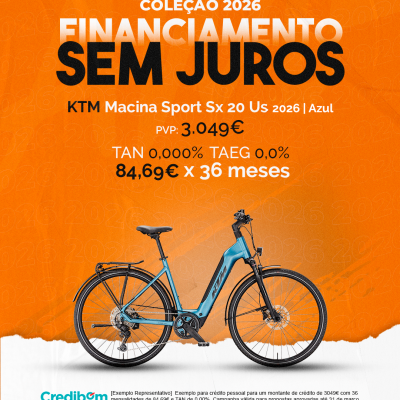 [Exemplo Representativo] Exemplo para crédito pessoal para um montante de crédito de 3.049€ com 36 mensalidades de 84,69€ e TAN de 0,00%. Campanha válida para propostas aprovadas até 31 de março de 2026, sujeitas a aprovação pelo Banco Credibom, S.A., entidade registada junto do BdP com o n.º 916. A AJSM Unipessoal Lda. é intermediária de crédito a título acessório, com o registo n.º 1657 no BdP e sem exclusividade ao Banco Credibom, S.A., podendo apresentar ou propor contratos de crédito a consumidores, prestar assistência a consumidores mediante a realização de atos preparatórios ou outros trabalhos de gestão pré-contratual relativamente a contratos de crédito que não tenham sido por si apresentados ou propostos. Apoio ao Cliente: 214 138 573 (chamada para a rede fixa nacional), 2ª a 6ª feira das 10h às 19h. AMBikes é uma marca que pertence ao intermediário de crédito AJSM Unipessoal Lda.