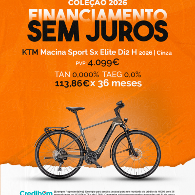 [Exemplo Representativo] Exemplo para crédito pessoal para um montante de crédito de 4.099€ com 36 mensalidades de 113,86€ e TAN de 0,00%. Campanha válida para propostas aprovadas até 31 de março de 2026, sujeitas a aprovação pelo Banco Credibom, S.A., entidade registada junto do BdP com o n.º 916. A AJSM Unipessoal Lda. é intermediária de crédito a título acessório, com o registo n.º 1657 no BdP e sem exclusividade ao Banco Credibom, S.A., podendo apresentar ou propor contratos de crédito a consumidores, prestar assistência a consumidores mediante a realização de atos preparatórios ou outros trabalhos de gestão pré-contratual relativamente a contratos de crédito que não tenham sido por si apresentados ou propostos. Apoio ao Cliente: 214 138 573 (chamada para a rede fixa nacional), 2ª a 6ª feira das 10h às 19h. AMBikes é uma marca que pertence ao intermediário de crédito AJSM Unipessoal Lda.