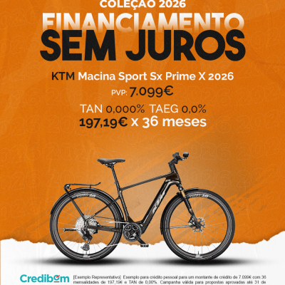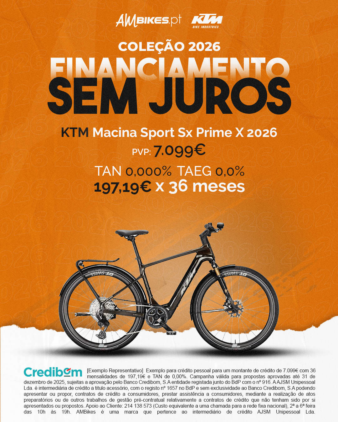 [Exemplo Representativo] Exemplo para crédito pessoal para um montante de crédito de 7.099€ com 36 mensalidades de 197,19€ e TAN de 0,00%. Campanha válida para propostas aprovadas até 31 de Dezembro de 2025, sujeitas a aprovação pelo Banco Credibom, S.A., entidade registada junto do BdP com o n.º 916. A AJSM Unipessoal Lda. é intermediária de crédito a título acessório, com o registo n.º 1657 no BdP e sem exclusividade ao Banco Credibom, S.A., podendo apresentar ou propor contratos de crédito a consumidores, prestar assistência a consumidores mediante a realização de atos preparatórios ou outros trabalhos de gestão pré-contratual relativamente a contratos de crédito que não tenham sido por si apresentados ou propostos. Apoio ao Cliente: 214 138 573 (chamada para a rede fixa nacional), 2ª a 6ª feira das 10h às 19h. AMBikes é uma marca que pertence ao intermediário de crédito AJSM Unipessoal Lda.