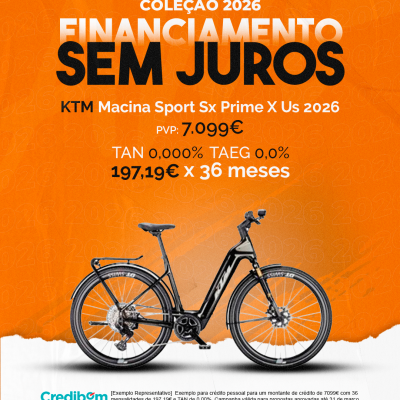 [Exemplo Representativo] Exemplo para crédito pessoal para um montante de crédito de 7.099€ com 36 mensalidades de 197,19€ e TAN de 0,00%. Campanha válida para propostas aprovadas até 31 de março de 2026, sujeitas a aprovação pelo Banco Credibom, S.A., entidade registada junto do BdP com o n.º 916. A AJSM Unipessoal Lda. é intermediária de crédito a título acessório, com o registo n.º 1657 no BdP e sem exclusividade ao Banco Credibom, S.A., podendo apresentar ou propor contratos de crédito a consumidores, prestar assistência a consumidores mediante a realização de atos preparatórios ou outros trabalhos de gestão pré-contratual relativamente a contratos de crédito que não tenham sido por si apresentados ou propostos. Apoio ao Cliente: 214 138 573 (chamada para a rede fixa nacional), 2ª a 6ª feira das 10h às 19h. AMBikes é uma marca que pertence ao intermediário de crédito AJSM Unipessoal Lda.