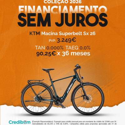 [Exemplo Representativo] Exemplo para crédito pessoal para um montante de crédito de 3.249,00 € com 36 mensalidades de 90,25€ e TAN de 0,00%. Campanha válida para propostas aprovadas até 31 de Dezembro de 2025, sujeitas a aprovação pelo Banco Credibom, S.A., entidade registada junto do BdP com o n.º 916. A AJSM Unipessoal Lda. é intermediária de crédito a título acessório, com o registo n.º 1657 no BdP e sem exclusividade ao Banco Credibom, S.A., podendo apresentar ou propor contratos de crédito a consumidores, prestar assistência a consumidores mediante a realização de atos preparatórios ou outros trabalhos de gestão pré-contratual relativamente a contratos de crédito que não tenham sido por si apresentados ou propostos. Apoio ao Cliente: 214 138 573 (chamada para a rede fixa nacional), 2ª a 6ª feira das 10h às 19h. AMBikes é uma marca que pertence ao intermediário de crédito AJSM Unipessoal Lda.