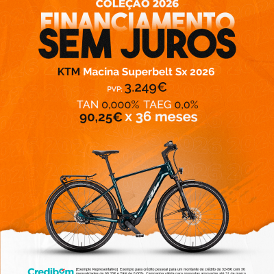 [Exemplo Representativo] Exemplo para crédito pessoal para um montante de crédito de 3.249,00 € com 36 mensalidades de 90,25€ e TAN de 0,00%. Campanha válida para propostas aprovadas até 31 de março de 2026, sujeitas a aprovação pelo Banco Credibom, S.A., entidade registada junto do BdP com o n.º 916. A AJSM Unipessoal Lda. é intermediária de crédito a título acessório, com o registo n.º 1657 no BdP e sem exclusividade ao Banco Credibom, S.A., podendo apresentar ou propor contratos de crédito a consumidores, prestar assistência a consumidores mediante a realização de atos preparatórios ou outros trabalhos de gestão pré-contratual relativamente a contratos de crédito que não tenham sido por si apresentados ou propostos. Apoio ao Cliente: 214 138 573 (chamada para a rede fixa nacional), 2ª a 6ª feira das 10h às 19h. AMBikes é uma marca que pertence ao intermediário de crédito AJSM Unipessoal Lda.
