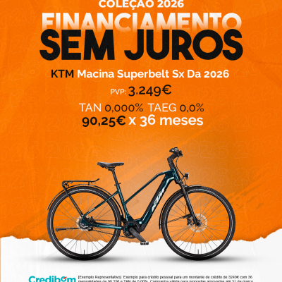 [Exemplo Representativo] Exemplo para crédito pessoal para um montante de crédito de 3.249,00 € com 36 mensalidades de 90,25€ e TAN de 0,00%. Campanha válida para propostas aprovadas até 31 de março de 2026, sujeitas a aprovação pelo Banco Credibom, S.A., entidade registada junto do BdP com o n.º 916. A AJSM Unipessoal Lda. é intermediária de crédito a título acessório, com o registo n.º 1657 no BdP e sem exclusividade ao Banco Credibom, S.A., podendo apresentar ou propor contratos de crédito a consumidores, prestar assistência a consumidores mediante a realização de atos preparatórios ou outros trabalhos de gestão pré-contratual relativamente a contratos de crédito que não tenham sido por si apresentados ou propostos. Apoio ao Cliente: 214 138 573 (chamada para a rede fixa nacional), 2ª a 6ª feira das 10h às 19h. AMBikes é uma marca que pertence ao intermediário de crédito AJSM Unipessoal Lda.