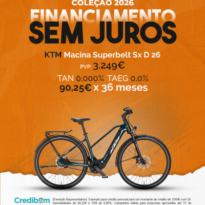 [Exemplo Representativo] Exemplo para crédito pessoal para um montante de crédito de 3.249,00 € com 36 mensalidades de 90,25€ e TAN de 0,00%. Campanha válida para propostas aprovadas até 31 de Dezembro de 2025, sujeitas a aprovação pelo Banco Credibom, S.A., entidade registada junto do BdP com o n.º 916. A AJSM Unipessoal Lda. é intermediária de crédito a título acessório, com o registo n.º 1657 no BdP e sem exclusividade ao Banco Credibom, S.A., podendo apresentar ou propor contratos de crédito a consumidores, prestar assistência a consumidores mediante a realização de atos preparatórios ou outros trabalhos de gestão pré-contratual relativamente a contratos de crédito que não tenham sido por si apresentados ou propostos. Apoio ao Cliente: 214 138 573 (chamada para a rede fixa nacional), 2ª a 6ª feira das 10h às 19h. AMBikes é uma marca que pertence ao intermediário de crédito AJSM Unipessoal Lda.