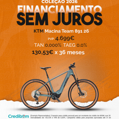 [Exemplo Representativo] Exemplo para crédito pessoal para um montante de crédito de 4.699,00 € com 36 mensalidades de 130,53 € e TAN de 0,00%. Campanha válida para propostas aprovadas até 31 de Dezembro de 2025, sujeitas a aprovação pelo Banco Credibom, S.A., entidade registada junto do BdP com o n.º 916. A AJSM Unipessoal Lda. é intermediária de crédito a título acessório, com o registo n.º 1657 no BdP e sem exclusividade ao Banco Credibom, S.A., podendo apresentar ou propor contratos de crédito a consumidores, prestar assistência a consumidores mediante a realização de atos preparatórios ou outros trabalhos de gestão pré-contratual relativamente a contratos de crédito que não tenham sido por si apresentados ou propostos. Apoio ao Cliente: 214 138 573 (chamada para a rede fixa nacional), 2ª a 6ª feira das 10h às 19h. AMBikes é uma marca que pertence ao intermediário de crédito AJSM Unipessoal Lda.