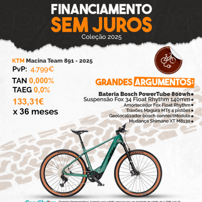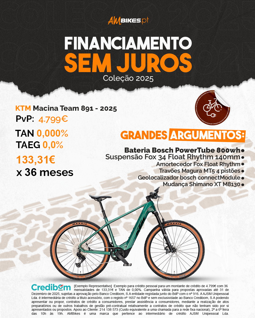 [Exemplo Representativo] Exemplo para crédito pessoal para um montante de crédito de 4799€ com 36 mensalidades de 133,31€ e TAN de 0,00%. Campanha válida para propostas aprovadas até 31 de Dezembro de 2025, sujeitas a aprovação pelo Banco Credibom, S.A entidade registada junto do BdP com o nº 916. A AJSM Unipessoal Lda. é intermediária de crédito a titulo acessório, com o registo nº 1657 no BdP e sem exclusividade ao Banco Credibom, S.A podendo apresentar ou propor, contratos de crédito a consumidores, prestar assistência a consumidores, mediante a realização de atos preparatórios ou de outros trabalhos de gestão pré-contratual relativamente a contratos de crédito que não tenham sido por si apresentados ou propostos. Apoio ao Cliente: 214 138 573 (Custo equivalente a uma chamada para a rede fixa nacional), 2ª a 6ª feira das 10h às 19h. AMBikes é uma marca que pertence ao intermediário de crédito AJSM Unipessoal Lda.