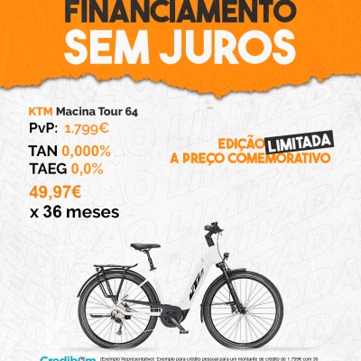 [Exemplo Representativo] Exemplo para crédito pessoal para um montante de crédito de 1499€ com 36 mensalidades de 41,67€ e TAN de 0,00%. Campanha válida para propostas aprovadas até 31 de dezembro de 2025, sujeitas a aprovação pelo Banco Credibom, S.A entidade registada junto do BdP com o nº 916. A AJSM Unipessoal Lda. é intermediária de crédito a titulo acessório, com o registo nº 1657 no BdP e sem exclusividade ao Banco Credibom, S.A podendo apresentar ou propor, contratos de crédito a consumidores, prestar assistência a consumidores, mediante a realização de atos preparatórios ou de outros trabalhos de gestão pré-contratual relativamente a contratos de crédito que não tenham sido por si apresentados ou propostos. Apoio ao Cliente: 214 138 573 (Custo equivalente a uma chamada para a rede fixa nacional), 2ª a 6ª feira das 10h às 19h. AMBikes é uma marca que pertence ao intermediário de crédito AJSM Unipessoal Lda.