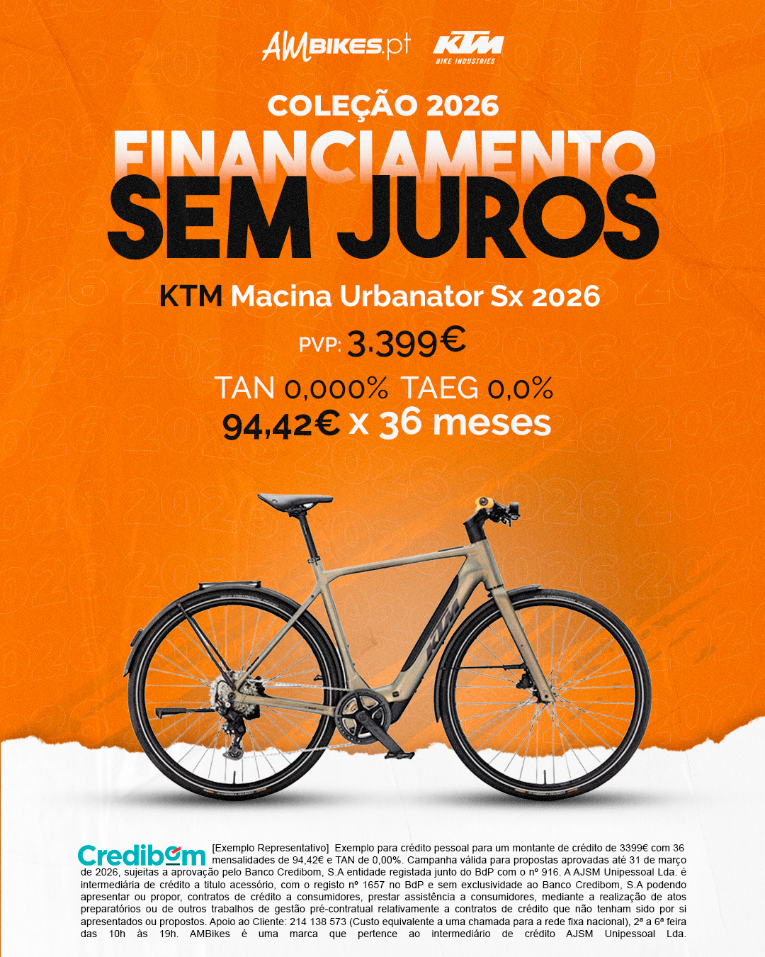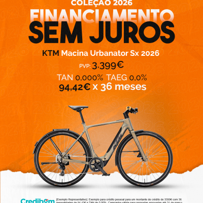 [Exemplo Representativo] Exemplo para crédito pessoal para um montante de crédito de 3.399,00 € com 36 mensalidades de 94,42€ e TAN de 0,00%. Campanha válida para propostas aprovadas até 31 de março de 2026, sujeitas a aprovação pelo Banco Credibom, S.A., entidade registada junto do BdP com o n.º 916. A AJSM Unipessoal Lda. é intermediária de crédito a título acessório, com o registo n.º 1657 no BdP e sem exclusividade ao Banco Credibom, S.A., podendo apresentar ou propor contratos de crédito a consumidores, prestar assistência a consumidores mediante a realização de atos preparatórios ou outros trabalhos de gestão pré-contratual relativamente a contratos de crédito que não tenham sido por si apresentados ou propostos. Apoio ao Cliente: 214 138 573 (chamada para a rede fixa nacional), 2ª a 6ª feira das 10h às 19h. AMBikes é uma marca que pertence ao intermediário de crédito AJSM Unipessoal Lda.