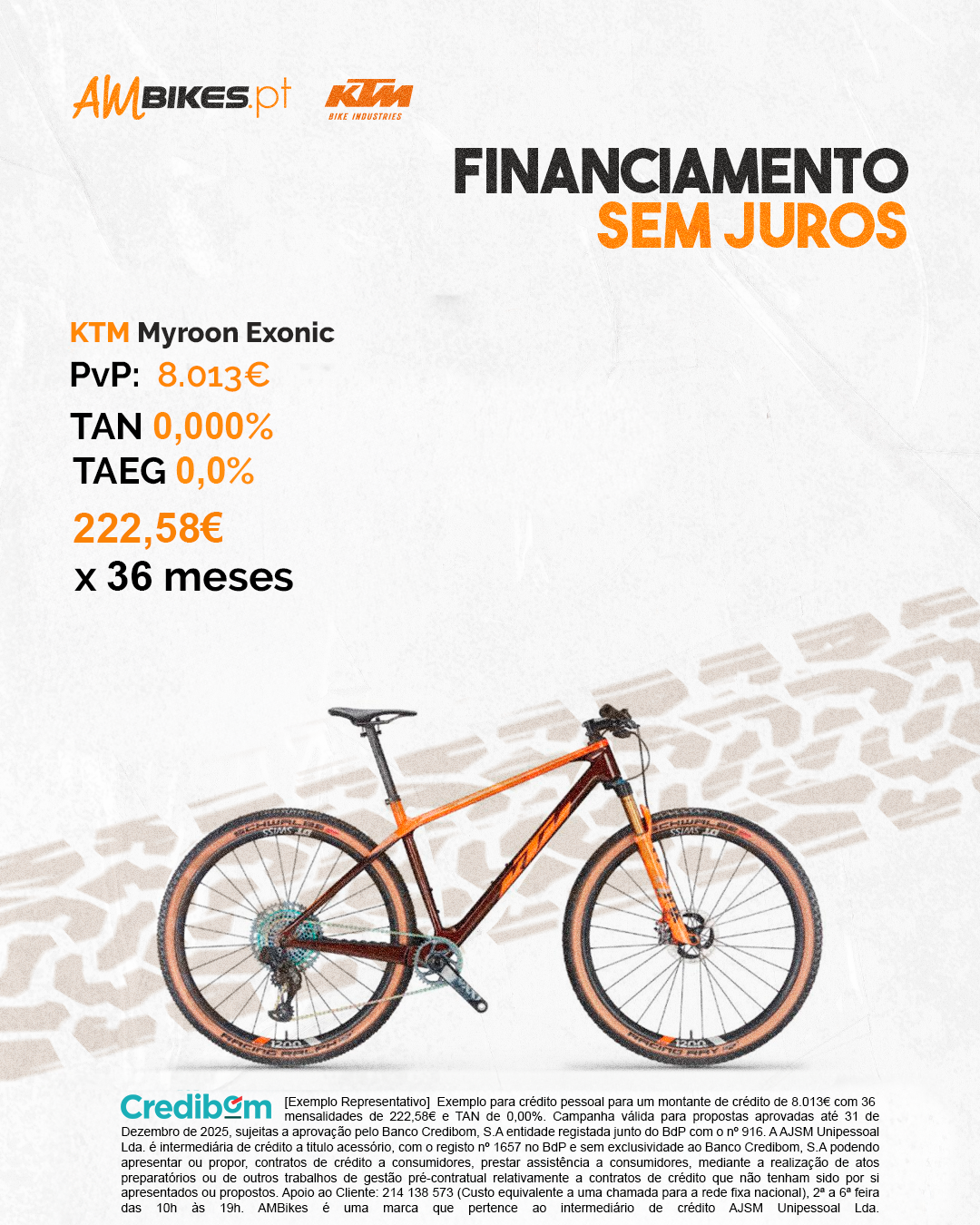 [Exemplo Representativo] Exemplo para crédito pessoal para um montante de crédito de 8013€ com 36 mensalidades de 222,58€ e TAN de 0,00%. Campanha válida para propostas aprovadas até 31 de Dezembro de 2025, sujeitas a aprovação pelo Banco Credibom, S.A entidade registada junto do BdP com o nº 916. A AJSM Unipessoal Lda. é intermediária de crédito a titulo acessório, com o registo nº 1657 no BdP e sem exclusividade ao Banco Credibom, S.A podendo apresentar ou propor, contratos de crédito a consumidores, prestar assistência a consumidores, mediante a realização de atos preparatórios ou de outros trabalhos de gestão pré-contratual relativamente a contratos de crédito que não tenham sido por si apresentados ou propostos. Apoio ao Cliente: 214 138 573 (Custo equivalente a uma chamada para a rede fixa nacional), 2ª a 6ª feira das 10h às 19h. AMBikes é uma marca que pertence ao intermediário de crédito AJSM Unipessoal Lda.