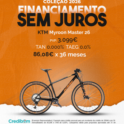 [Exemplo Representativo] Exemplo para crédito pessoal para um montante de crédito de 3.099,00 € com 36 mensalidades de 86,08€ e TAN de 0,00%. Campanha válida para propostas aprovadas até 31 de Dezembro de 2025, sujeitas a aprovação pelo Banco Credibom, S.A., entidade registada junto do BdP com o n.º 916. A AJSM Unipessoal Lda. é intermediária de crédito a título acessório, com o registo n.º 1657 no BdP e sem exclusividade ao Banco Credibom, S.A., podendo apresentar ou propor contratos de crédito a consumidores, prestar assistência a consumidores mediante a realização de atos preparatórios ou outros trabalhos de gestão pré-contratual relativamente a contratos de crédito que não tenham sido por si apresentados ou propostos. Apoio ao Cliente: 214 138 573 (chamada para a rede fixa nacional), 2ª a 6ª feira das 10h às 19h. AMBikes é uma marca que pertence ao intermediário de crédito AJSM Unipessoal Lda.