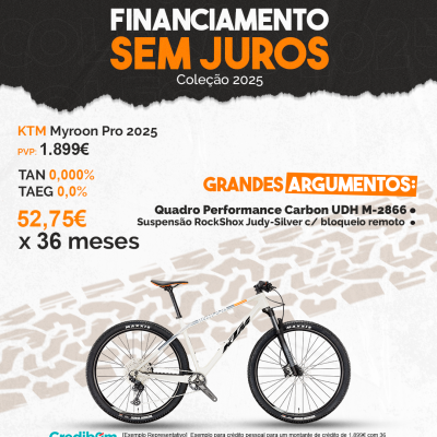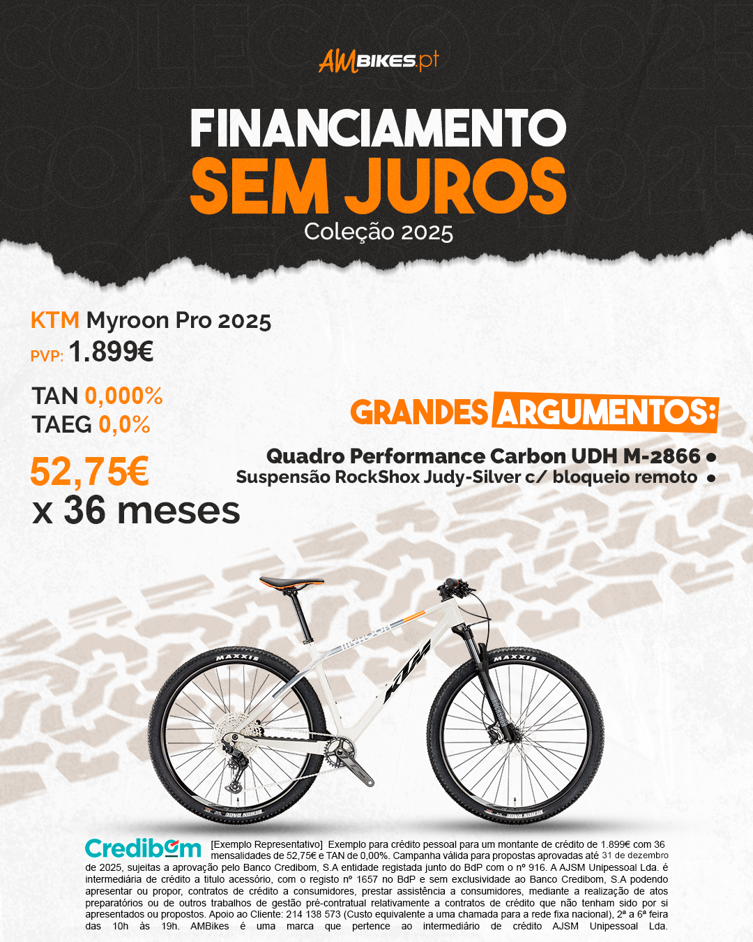 [Exemplo Representativo] Exemplo para crédito pessoal para um montante de crédito de 1899€ com 36 mensalidades de 52,75€ e TAN de 0,00%. Campanha válida para propostas aprovadas até 31 de dezembro de 2025, sujeitas a aprovação pelo Banco Credibom, S.A entidade registada junto do BdP com o nº 916. A AJSM Unipessoal Lda. é intermediária de crédito a titulo acessório, com o registo nº 1657 no BdP e sem exclusividade ao Banco Credibom, S.A podendo apresentar ou propor, contratos de crédito a consumidores, prestar assistência a consumidores, mediante a realização de atos preparatórios ou de outros trabalhos de gestão pré-contratual relativamente a contratos de crédito que não tenham sido por si apresentados ou propostos. Apoio ao Cliente: 214 138 573 (Custo equivalente a uma chamada para a rede fixa nacional), 2ª a 6ª feira das 10h às 19h. AMBikes é uma marca que pertence ao intermediário de crédito AJSM Unipessoal Lda.