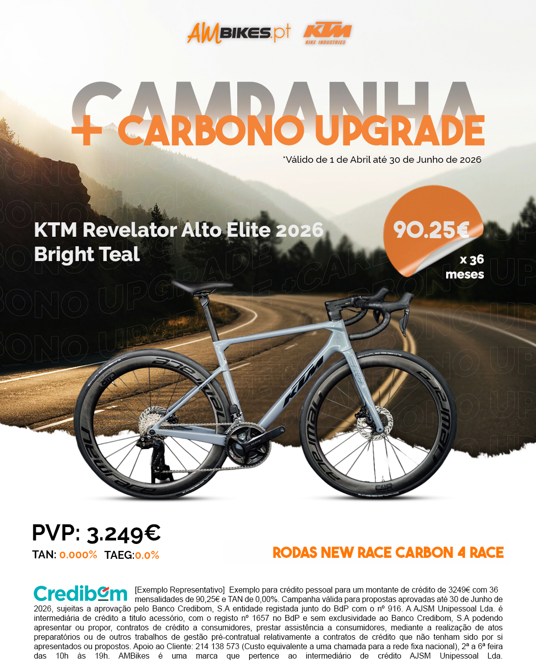 [Exemplo Representativo] Exemplo para crédito pessoal para um montante de crédito de 3249€ com 36 mensalidades de 90,25€ e TAN de 0,00%. Campanha válida para propostas aprovadas até 30 de Junho de 2026, sujeitas a aprovação pelo Banco Credibom, S.A., entidade registada junto do BdP com o nº 916. A AJSM Unipessoal Lda. é intermediária de crédito a título acessório, com o registo nº 1657 no BdP e sem exclusividade ao Banco Credibom, S.A., podendo apresentar ou propor contratos de crédito a consumidores e prestar assistência pré-contratual. Apoio ao Cliente: 214 138 573 (custo de chamada para a rede fixa nacional), de 2ª a 6ª feira, das 10h às 19h. AMBikes é uma marca pertencente ao intermediário de crédito AJSM Unipessoal Lda.