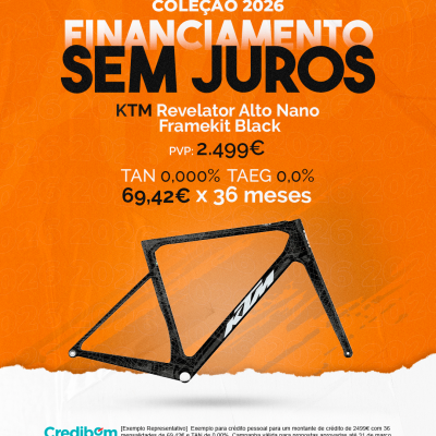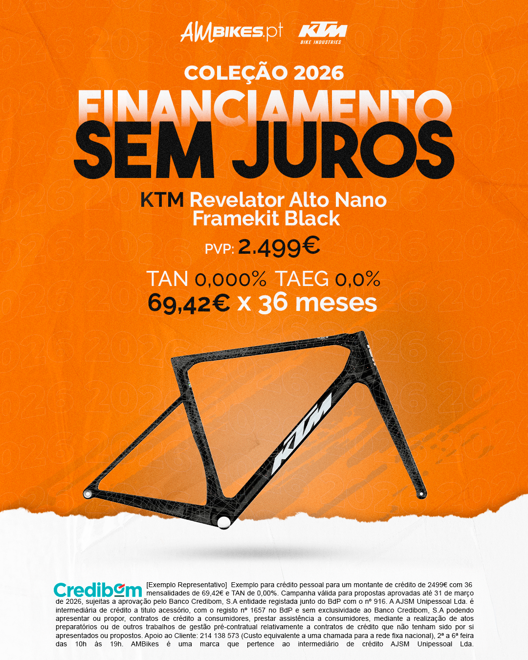 [Exemplo Representativo] Exemplo para crédito pessoal para um montante de crédito de 2.499,00 € com 36 mensalidades de 69,42€ e TAN de 0,00%. Campanha válida para propostas aprovadas até 31 de março de 2026, sujeitas a aprovação pelo Banco Credibom, S.A., entidade registada junto do BdP com o n.º 916. A AJSM Unipessoal Lda. é intermediária de crédito a título acessório, com o registo n.º 1657 no BdP e sem exclusividade ao Banco Credibom, S.A., podendo apresentar ou propor contratos de crédito a consumidores, prestar assistência a consumidores mediante a realização de atos preparatórios ou outros trabalhos de gestão pré-contratual relativamente a contratos de crédito que não tenham sido por si apresentados ou propostos. Apoio ao Cliente: 214 138 573 (chamada para a rede fixa nacional), 2ª a 6ª feira das 10h às 19h. AMBikes é uma marca que pertence ao intermediário de crédito AJSM Unipessoal Lda.