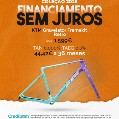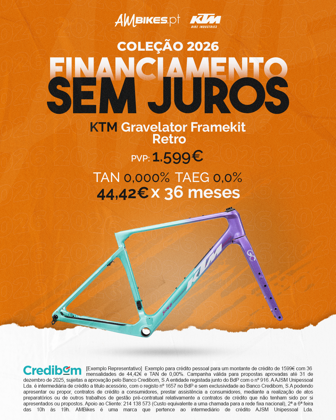 [Exemplo Representativo] Exemplo para crédito pessoal para um montante de crédito de 1.599,00 € com 36 mensalidades de 44,42€ e TAN de 0,00%. Campanha válida para propostas aprovadas até 31 de Dezembro de 2025, sujeitas a aprovação pelo Banco Credibom, S.A., entidade registada junto do BdP com o n.º 916. A AJSM Unipessoal Lda. é intermediária de crédito a título acessório, com o registo n.º 1657 no BdP e sem exclusividade ao Banco Credibom, S.A., podendo apresentar ou propor contratos de crédito a consumidores, prestar assistência a consumidores mediante a realização de atos preparatórios ou outros trabalhos de gestão pré-contratual relativamente a contratos de crédito que não tenham sido por si apresentados ou propostos. Apoio ao Cliente: 214 138 573 (chamada para a rede fixa nacional), 2ª a 6ª feira das 10h às 19h. AMBikes é uma marca que pertence ao intermediário de crédito AJSM Unipessoal Lda.