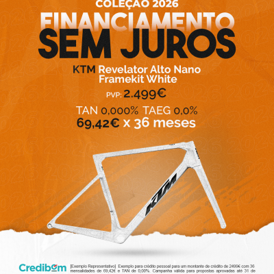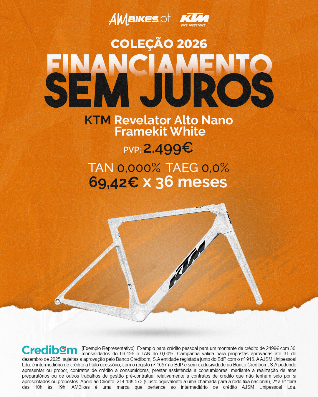 [Exemplo Representativo] Exemplo para crédito pessoal para um montante de crédito de 2.499,00 € com 36 mensalidades de 62,42€ e TAN de 0,00%. Campanha válida para propostas aprovadas até 31 de Dezembro de 2025, sujeitas a aprovação pelo Banco Credibom, S.A., entidade registada junto do BdP com o n.º 916. A AJSM Unipessoal Lda. é intermediária de crédito a título acessório, com o registo n.º 1657 no BdP e sem exclusividade ao Banco Credibom, S.A., podendo apresentar ou propor contratos de crédito a consumidores, prestar assistência a consumidores mediante a realização de atos preparatórios ou outros trabalhos de gestão pré-contratual relativamente a contratos de crédito que não tenham sido por si apresentados ou propostos. Apoio ao Cliente: 214 138 573 (chamada para a rede fixa nacional), 2ª a 6ª feira das 10h às 19h. AMBikes é uma marca que pertence ao intermediário de crédito AJSM Unipessoal Lda.