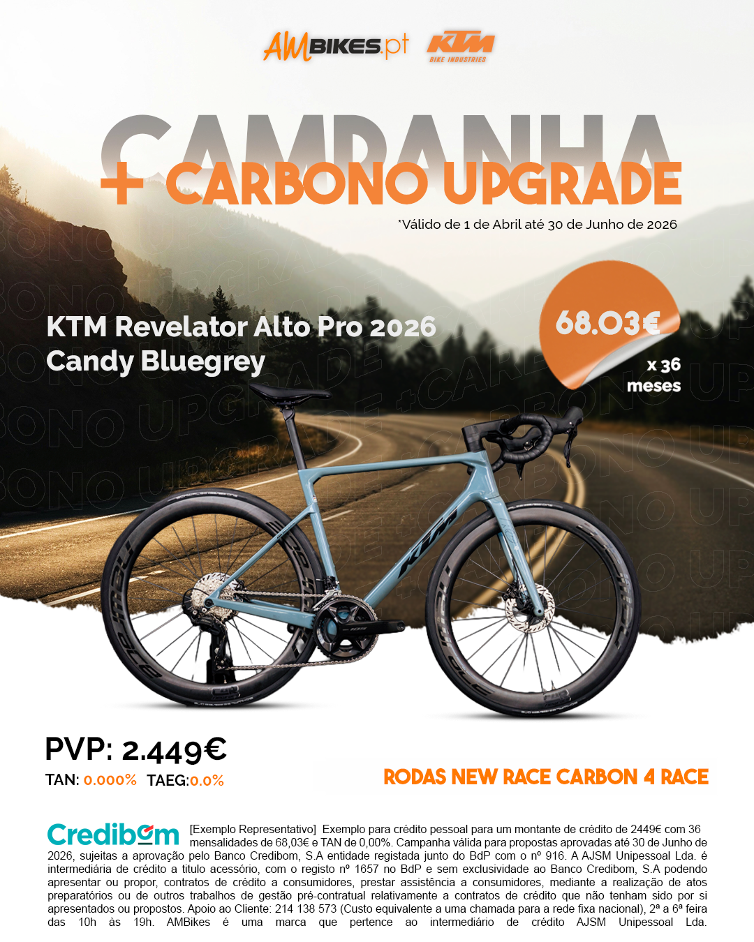 [Exemplo Representativo] Exemplo para crédito pessoal para um montante de crédito de 2449€ com 36 mensalidades de 68,03€€ e TAN de 0,00%. Campanha válida para propostas aprovadas até 30 de Junho de 2026, sujeitas a aprovação pelo Banco Credibom, S.A., entidade registada junto do BdP com o nº 916. A AJSM Unipessoal Lda. é intermediária de crédito a título acessório, com o registo nº 1657 no BdP e sem exclusividade ao Banco Credibom, S.A., podendo apresentar ou propor contratos de crédito a consumidores e prestar assistência pré-contratual. Apoio ao Cliente: 214 138 573 (custo de chamada para a rede fixa nacional), de 2ª a 6ª feira, das 10h às 19h. AMBikes é uma marca pertencente ao intermediário de crédito AJSM Unipessoal Lda.