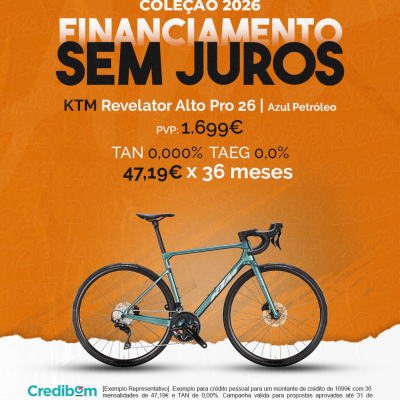 [Exemplo Representativo] Exemplo para crédito pessoal para um montante de crédito de 1.699,00 € com 36 mensalidades de 47,19 € e TAN de 0,00%. Campanha válida para propostas aprovadas até 31 de Dezembro de 2025, sujeitas a aprovação pelo Banco Credibom, S.A., entidade registada junto do BdP com o n.º 916. A AJSM Unipessoal Lda. é intermediária de crédito a título acessório, com o registo n.º 1657 no BdP e sem exclusividade ao Banco Credibom, S.A., podendo apresentar ou propor contratos de crédito a consumidores, prestar assistência a consumidores mediante a realização de atos preparatórios ou outros trabalhos de gestão pré-contratual relativamente a contratos de crédito que não tenham sido por si apresentados ou propostos. Apoio ao Cliente: 214 138 573 (chamada para a rede fixa nacional), 2ª a 6ª feira das 10h às 19h. AMBikes é uma marca que pertence ao intermediário de crédito AJSM Unipessoal Lda.